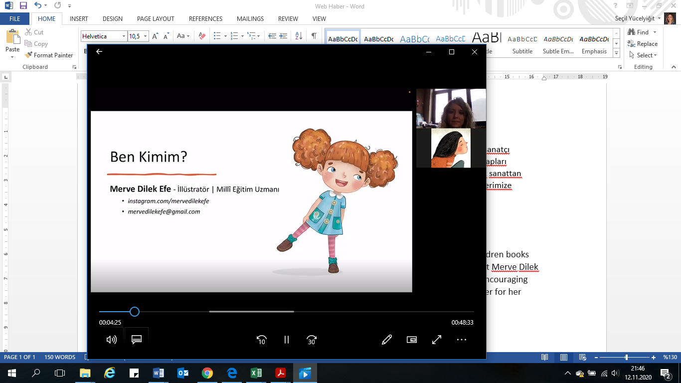ECEP 301- Erken Çocuklukta Sanat Eğitimi dersine 5 Kasım 2020 tarihinde, hem eğitimci hem illüstratör kimliğine sahip bir konuk konuşmacı katılmıştır. Milli Eğitim Bakanlığı Eğitim Uzmanı Merve Dilek Efe, çocuk kitapları resimlemek, çocukları çizim yapmaya teşvik etmek, çocukların kendilerini yansıtma yolu olarak sanattan yararlanmak konularında değerli katkılarda bulundu. Kendisine etkileşimli sunumu ve öğrencilerimize kazandırdığı bakış açısı için teşekkür ederiz.
