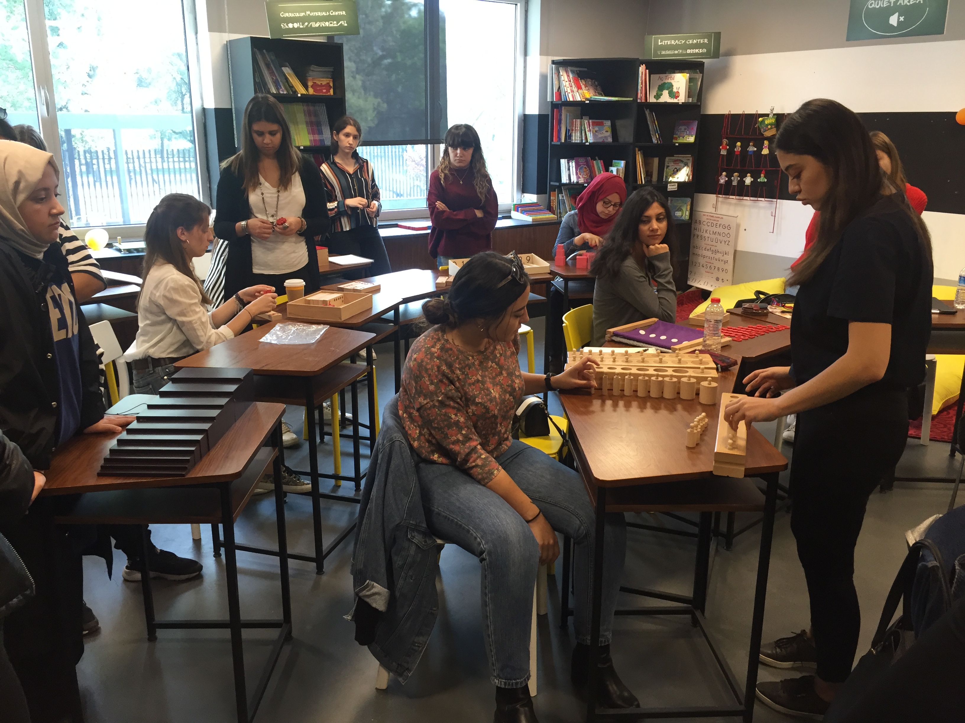 Early Childhood Education Models and Approaches were mentioned in the “Introduction to Early Childhood Education” (ECE 201-ECEP101) course. Historical and theoretical bases of the models, the nature of the curriculum practices, basic elements of the models, activities held in the models, teachers’ role and the assessment elements were mentioned throughout the course. Sudents involved in the course, met with Montessori Materials which are considered primary elements of the Montessori Approach and also had a chance of conducting some hands-on experiences. Through engaging in practice of materials, they have learnt how to support practical life skills of children, how to stimulate children’s senses, enrich experiences, and how to use academic materials to promote reading, writing and mathemetical skills of young children.