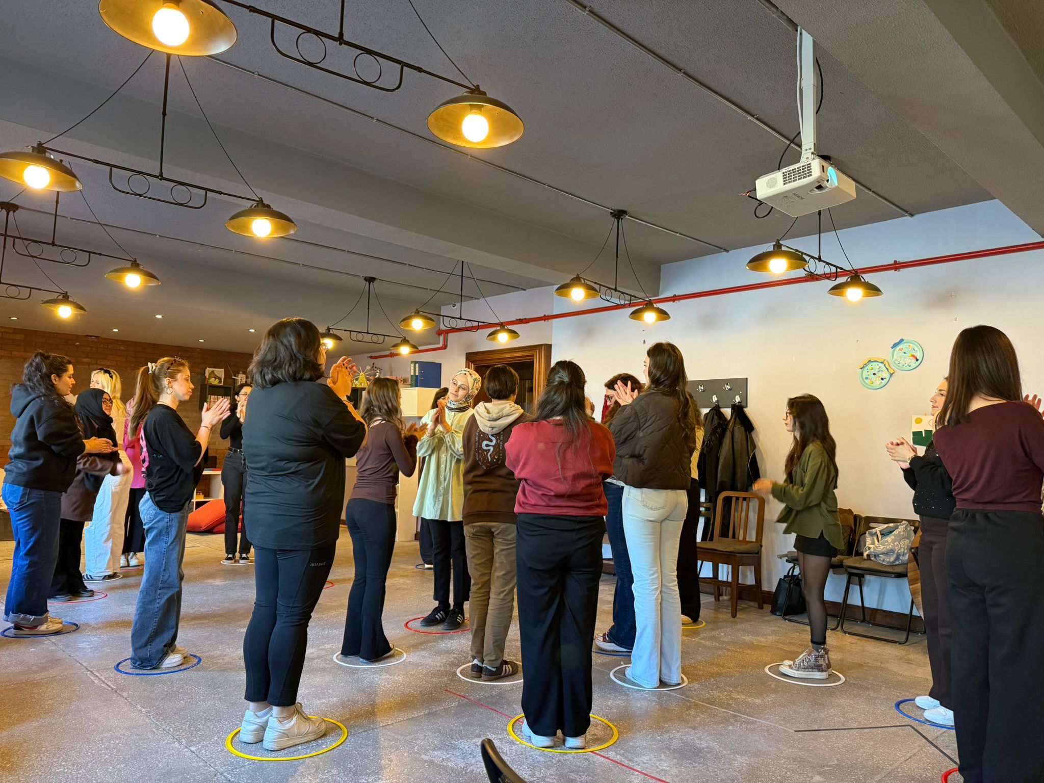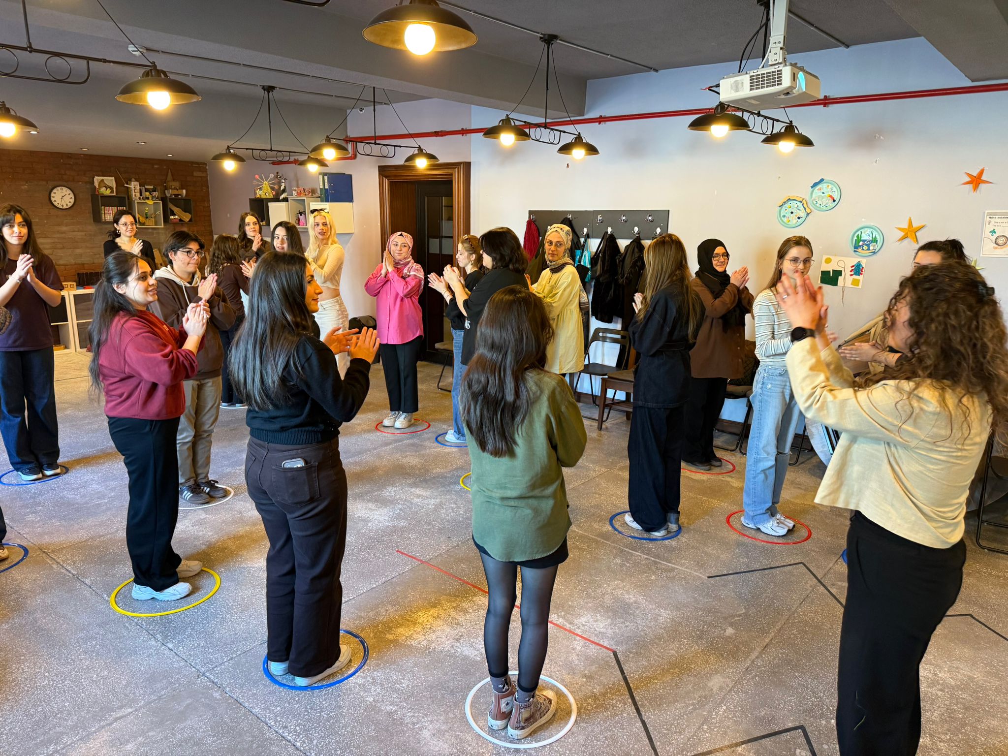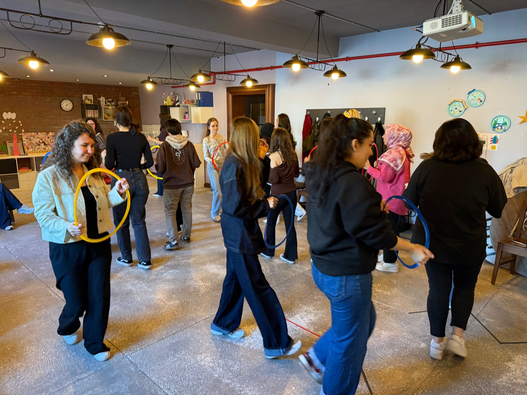 In the guest lecture, various rhythm activities were carried out with the 4th-year pre-service preschool teachers taking the course, using body percussion, coordination hoops, rhythm sticks, and colorful scarves; hands-on practices were conducted together with the teacher candidates.