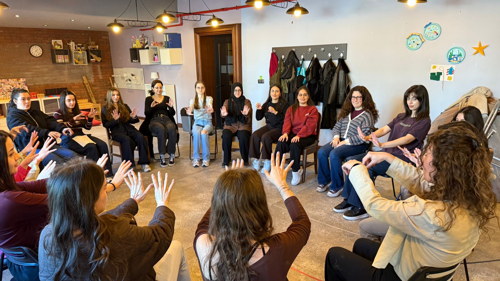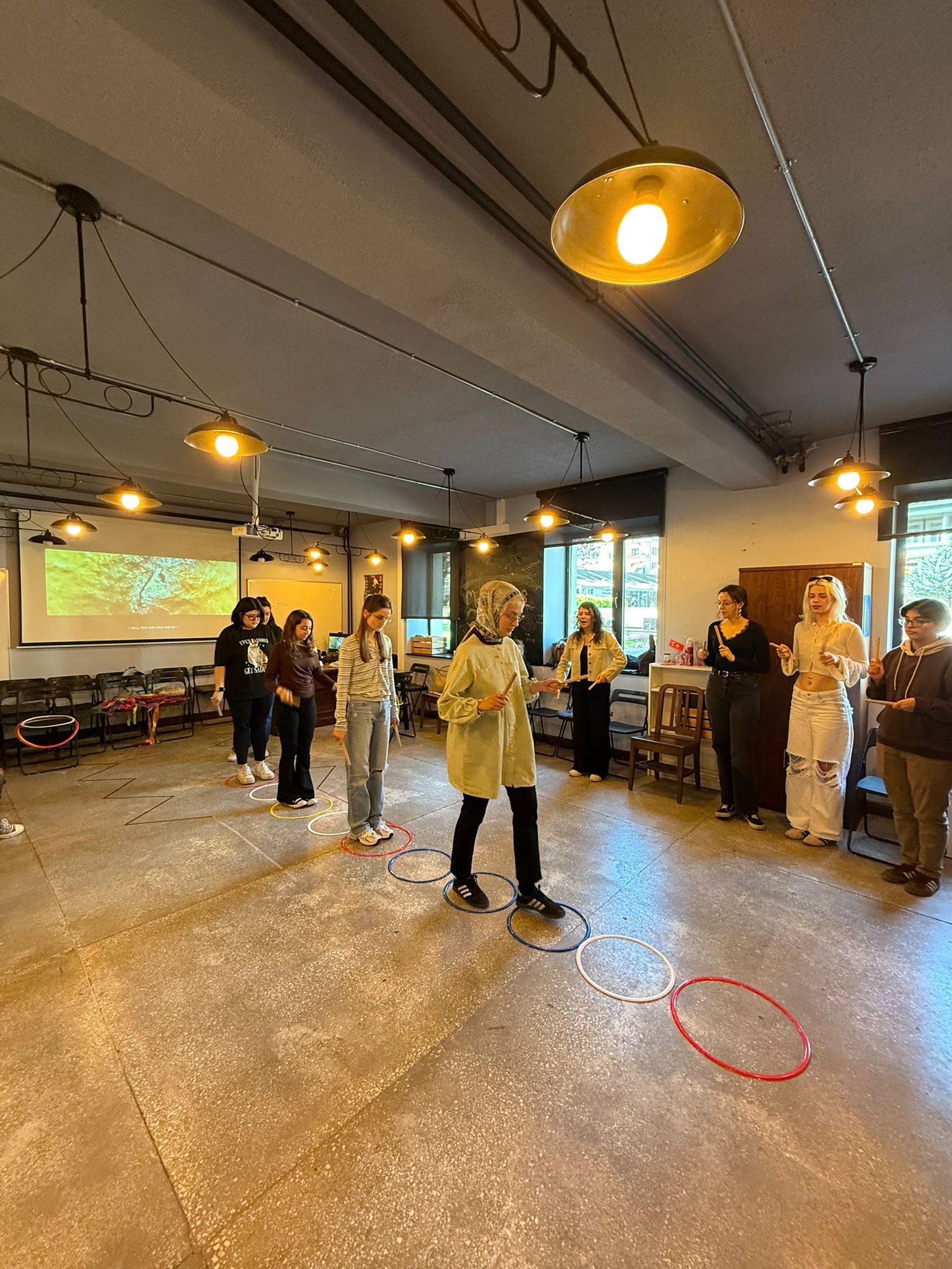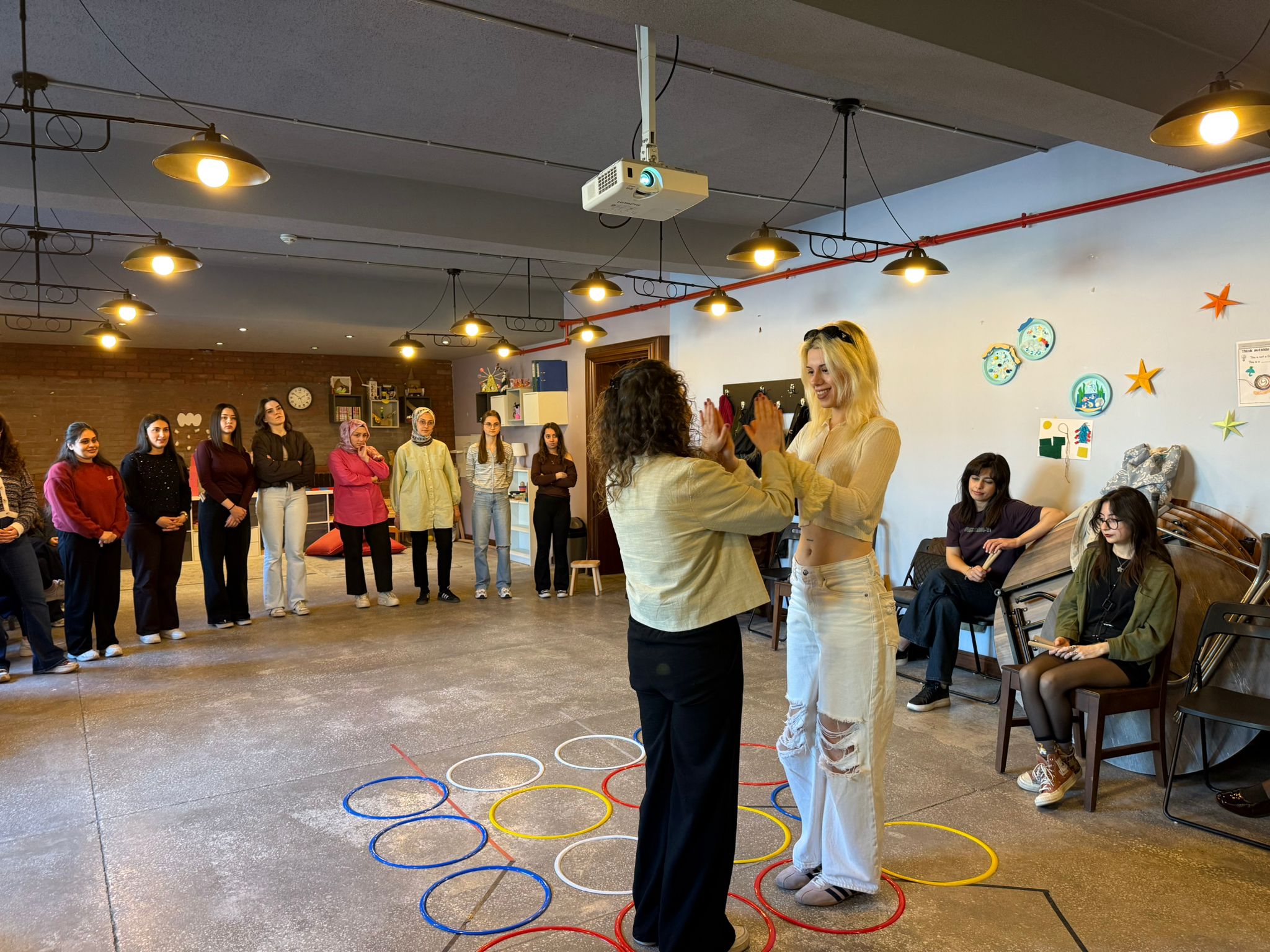In the guest lecture, various rhythm activities were carried out with the 4th-year pre-service preschool teachers taking the course, using body percussion, coordination hoops, rhythm sticks, and colorful scarves; hands-on practices were conducted together with the teacher candidates.