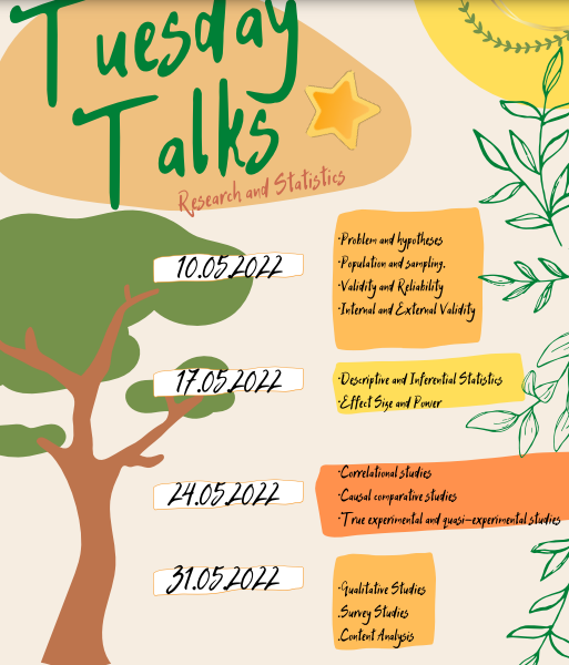 Son sınıf öğrencilerimiz Bil. Uzm. Melike Kandemir’in gerçekleştirdiği “Tuesday Talks” programına katıldılar. 10.05.2022 ve 31.05.2022 tarihleri arasında gerçekleştirilen, araştırma ve istatistik konularının konuşulduğu bu buluşmalarda öğrencilerimiz öğrendikleri konuları tekrar edip merak ettiklerini sordular. Akademik deneyimlerinde faydalı olacağına inandığımız bu programa katılımları için öğrencilerimize teşekkür ederiz.